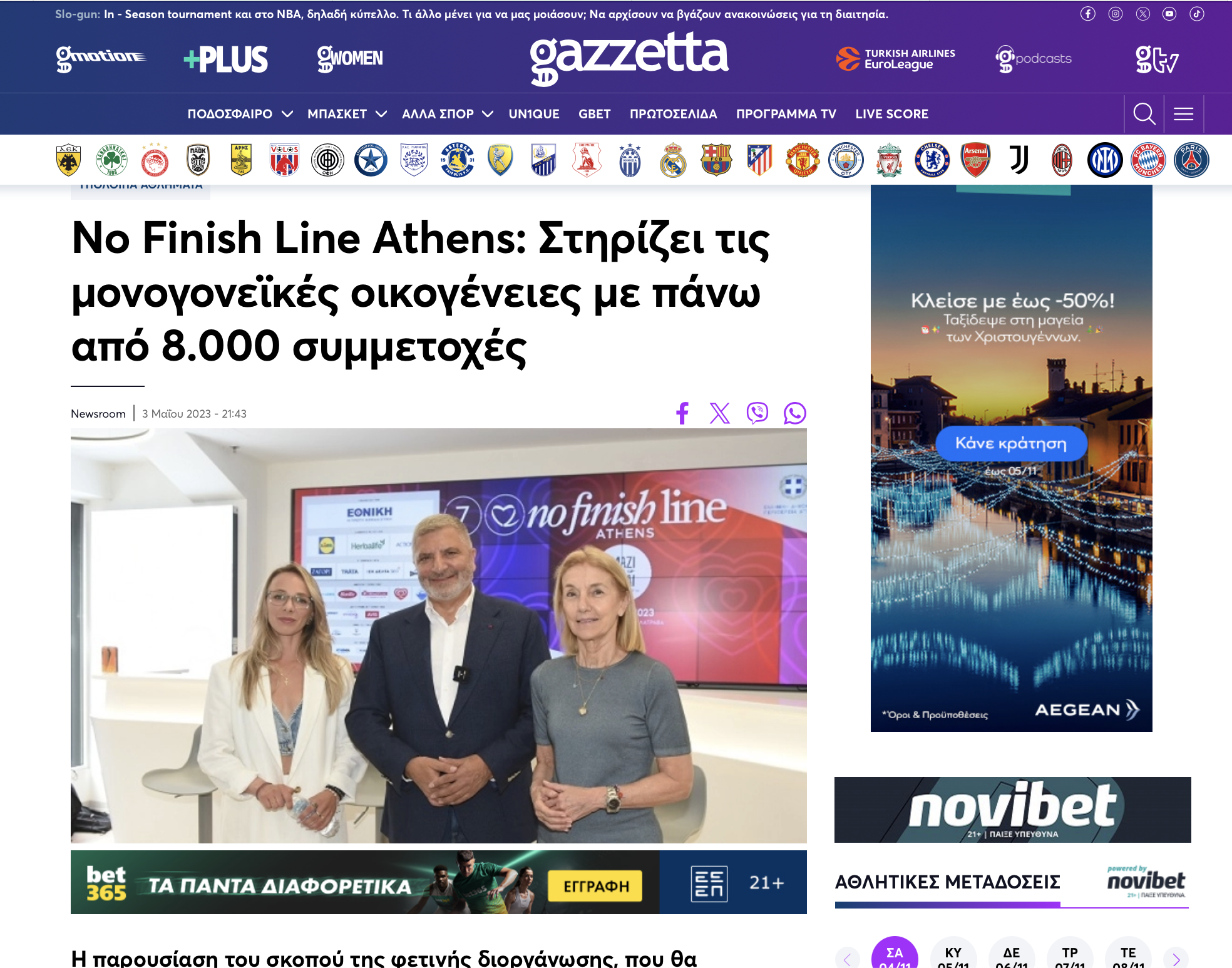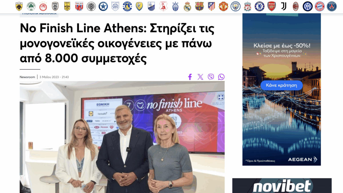 Το No Finish Line Athens μετρά αντίστροφα για την έβδομη διοργάνωσή του που θα πραγματοποιηθεί από τις 10 έως τις 14 Μαΐου στο ΟΑΚΑ, με την Οργανωτική Επιτροπή να παρουσιάζει τον διεθνή φιλανθρωπικό αγώνα παρουσία του Περιφερειάρχη Αττικής, Γιώργου Πατούλη, της Προέδρου του «Μαζί για το Παιδί», Αλεξάνδρας Μαρτίνου, της Προέδρου του «No Finish Line Athens», Σοφίας Κέδε, της Πρέσβειρας της διοργάνωσης Ολυμπιονίκη του βάδην και δις πρωταθλήτριας Ευρώπης, Αντιγόνης Ντρισμπιώτη, του Προέδρου της Παραολυμπιακής Επιτροπής, Γιώργου Καπελλάκη, καθώς και του διευθύνοντα συμβούλου του διεθνή οργανισμού No Finish Line International Γιάννη Νικολάου.