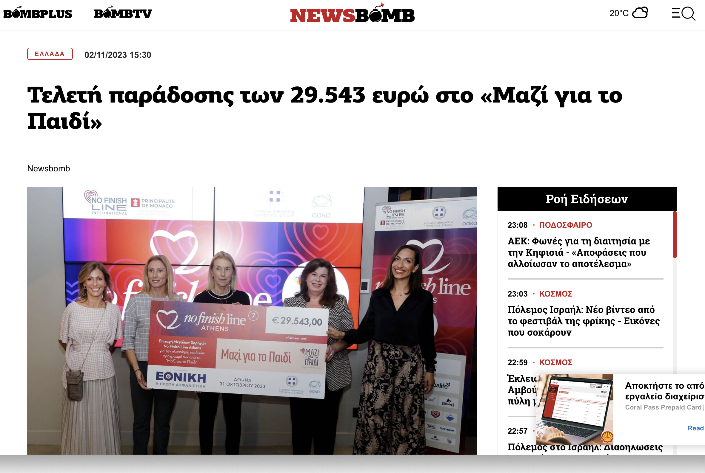 Παρουσία του Αναπληρωτή Υπουργού Αθλητισμού, κ. Ιωάννη Βρούτση, της Υφυπουργού Παιδείας, κ. Δόμνα Μιχαηλίδου, του Προέδρου της ΔΟΑ, κ. Ισίδωρου Κούβελου, της Αντιπεριφερειάρχη Αττικής, κ. Λουκία Κεφαλογιάννη, του τομεάρχη αθλητισμού του ΠΑΣΟΚ, κ. Θανάση Ζαννιά, των Πρεσβευτών του No Finish Line Athens, κ. Κατερίνα Θάνου και κ. Σπύρο Ανδριόπουλο, η Πρόεδρος του No Finish Line Athens, κ. Σοφία Κέδε, μαζί με τον Διευθύνοντα Σύμβουλο του διεθνή οργανισμού No Finish Line International, κ. Γιάννη Νικολάου παρέδωσαν την επιταγή στην Πρόεδρο του «Μαζί για το Παιδί», κ. Αλεξάνδρα Μαρτίνου, με στόχο την ενίσχυση των μονογονεϊκών οικογενειών με ανήλικα παιδιά.