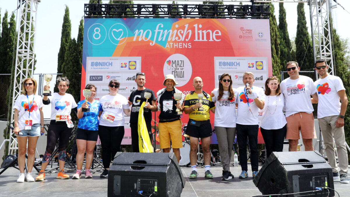 Η αυλαία του 100ωρου υπερμαραθωνίου αγώνα άθλησης και προσφοράς, έπεσε με την πρόεδρο της διοργάνωσης Σοφία Κέδε και τον διευθύνοντα σύμβουλο του No Finish Line International Γιάννη Νικολάου, μαζί με την κόρη της προέδρου του «Μαζί για το Παιδί» Αλίκη Μαρτίνου και τη διευθύντρια της ένωσης Λένια Κοντογούρη, να υποδέχονται στην Αγορά του ΟΑΚΑ την υπουργό κοινωνικής συνοχής και οικογένειας, Σοφία Ζαχαράκη, που δήλωσε παρούσα στο 8ο No Finish Line Athens κάνοντας μάλιστα και την απονομή του κυπέλλου στην 1η ομάδα της γενικής κατάταξης, το 7ο Δημοτικό Σχολείο Αγίας Παρασκευής συνεργαζόμενο με το Ειδικό Σχολείο Πεντέλης.