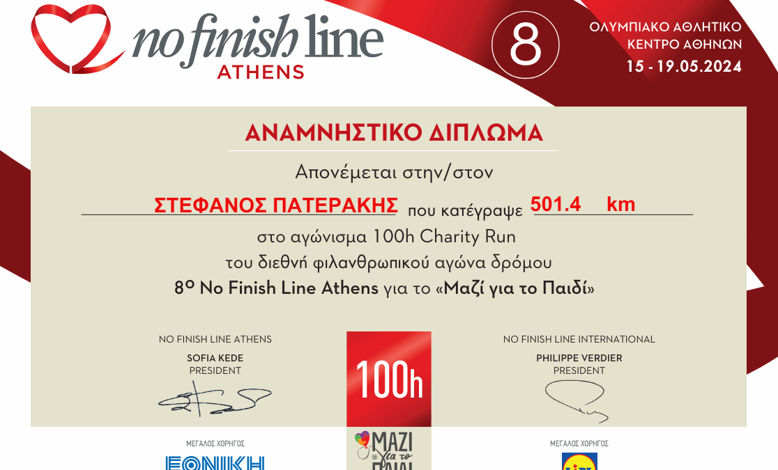 Το 8ο No Finish Line Athens «έγραψε» τη δική του ιστορία με τους 9.898 δρομείς και περιπατητές να συγκεντρώνουν περισσότερα από 100.000 χιλιόμετρα προσφοράς στο «Μαζί για το Παιδί» καταρρίπτοντας ταυτόχρονα και 7 ρεκόρ αγώνων!