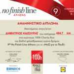 1 Οκτωβρίου, 202597.225 χιλιόμετρα Αγάπης για το “Μαζί για το Παιδί”, κατέγραψαν συνολικά οι περισσότεροι από τους 8.000 δρομείς που συμμετείχαν στο 9ο No Finish Line Athens, τον κορυφαίο φιλανθρωπικό αγώνα δρόμου στην Ελλάδα, ο οποίος πραγματοποιήθηκε από την Τετάρτη 7 Μαΐου έως και την Κυριακή 11 Μαΐου 2025 στην Αγορά του ΟΑΚΑ.