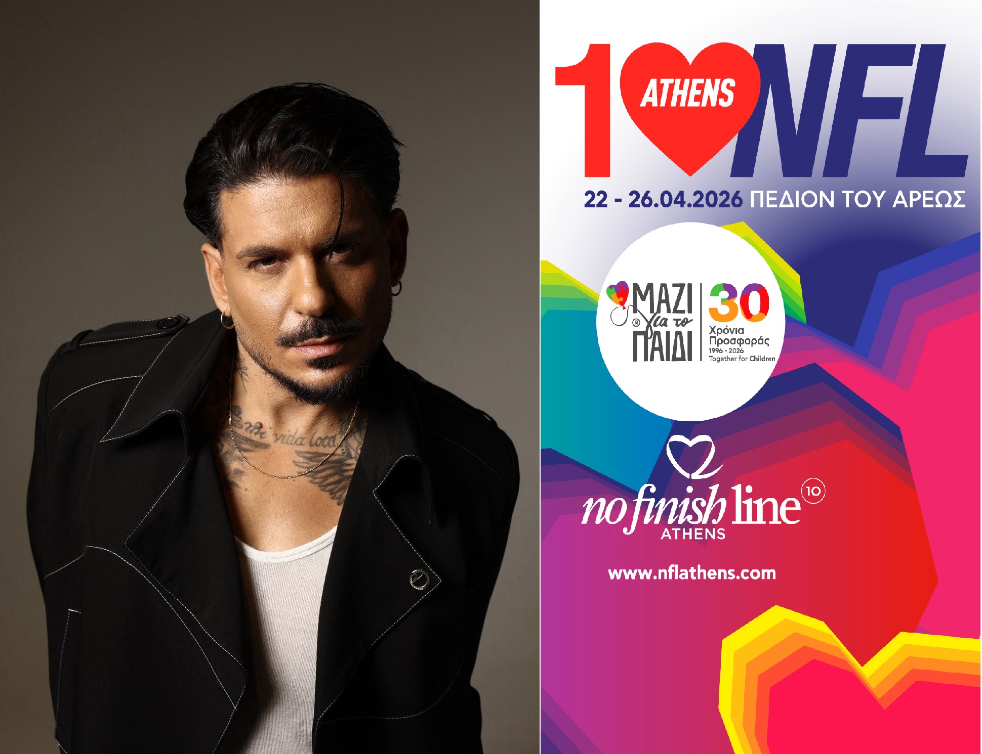 Ο αγαπημένος ερμηνευτής, ο οποίος μετρά 15 χρόνια αδιάκοπης μουσικής πορείας με εξαιρετικές συνεργασίες, αποδέχθηκε το κάλεσμα του NFL Athens και ως Πρεσβευτής του 10ου NFL Athens θα «χαρίσει» τη φωνή και την ενέργειά του στους χιλιάδες συμμετέχοντες που θα βρίσκονται στο Πεδίον του Άρεως, προσφέροντας χιλιόμετρα Αγάπης για το «Μαζί για το Παιδί».
