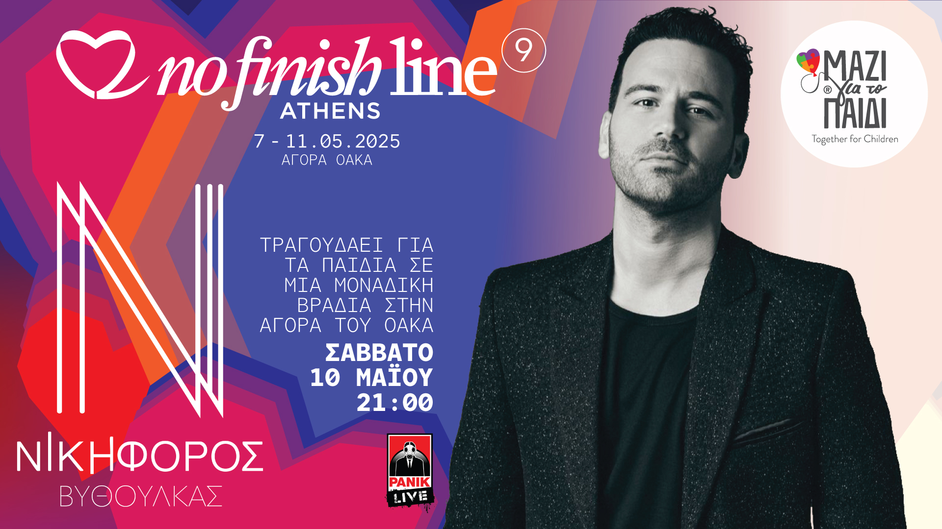 Ο μοναδικός Νικηφόρος Βυθούλκας θα είναι live στη σκηνή του No Finish Line, τον αγώνα που διεξάγεται για να στηρίξει οικογένειες με παιδιά που αντιμετωπίζουν σοβαρό πρόβλημα υγείας ή αναπηρία, σε μία μοναδική βραδιά στην Αγορά του ΟΑΚΑ με ελεύθερη είσοδο για όσους συμμετέχουν, αλλά και όσους θέλουν να στηρίξουν δηλώνοντας συμμετοχή στη γραμματεία της διοργάνωσης.
