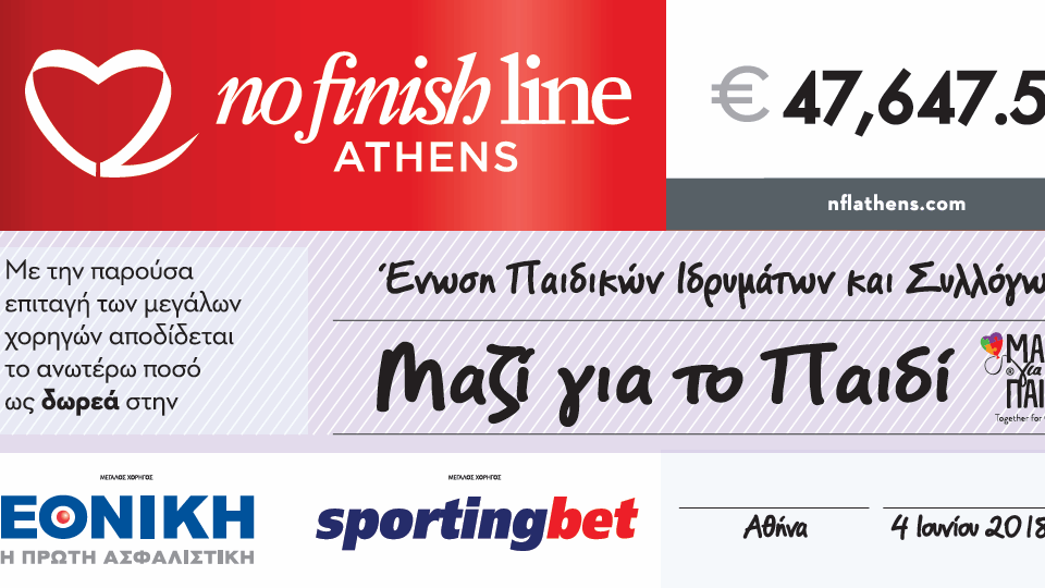 3 Ιουνίου, 2018Τα χρήματα του No Finish Line στο Μαζί για το ΠαιδίΤην Δευτέρα 4 Ιουνίου στις 19:00 θα δοθούν στην Ένωση «Μαζί για το Παιδί» τα χρήματα που συγκεντρώθηκαν στο 2ο No Finish Line Athens που έγινε […]