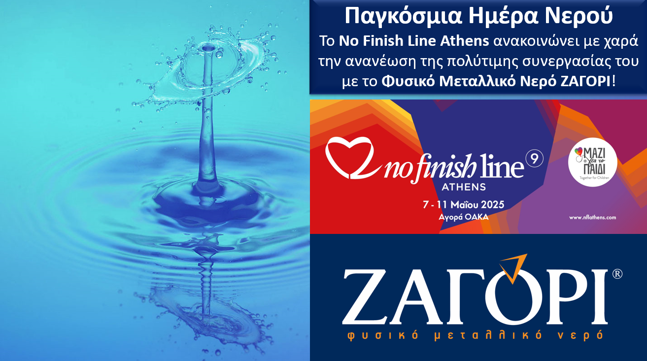 Στις 22 Μαρτίου 2025 γιορτάζεται η Παγκόσμια Ημέρα Νερού και το No Finish Line Athens ανακοινώνει με ιδιαίτερη χαρά την ανανέωση της χορηγικής του συνεργασίας με το Φυσικό Μεταλλικό Νερό ΖΑΓΟΡΙ.